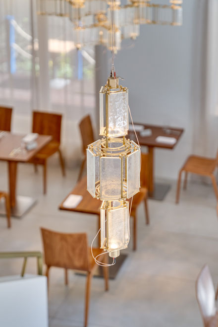 At Oliva Restaurant, Oboladze Lighting was used to enhance the Mediterranean-inspired interior, highlighting sand-colored elements and blue accents while maintaining the minimalist style. Our handcrafted wall lamps provide subtle accents that complement natural materials like quartzite and wood, adding depth and warmth. By enriching the interior with high-quality lighting details, we support a calm, inviting atmosphere that balances tradition and modernity.